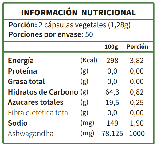 Ingredientes: Ashwagandha, HPMC de la cápsula, agua.